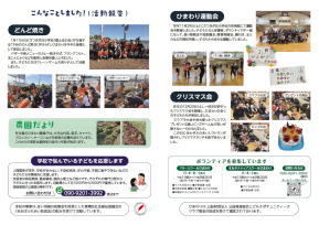 | 開校曜日 月曜日、水曜日、金曜日、土曜日 開講時間 10時~14時30分 対象学年 小学生、中学生(高校生は準ボランティアとして受け入れ) 支援内容 居場所・ソーシャルスキル支援・学習支援 |